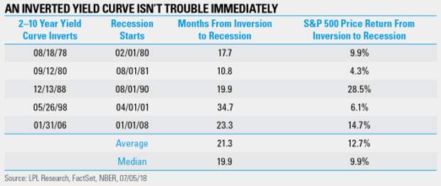 But what happens when the yield curve inverts? As our LPL Chart of the Day shows, even inverted yield curves don’t always equal near-term trouble for equities.
