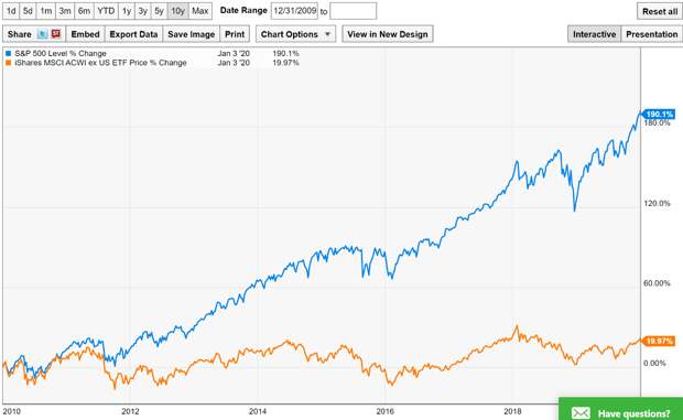 Case in point, over the last decade, the S&P 500 ended up about 190%. But the ACWX (which, in a nutshell, tracks an index composed of large- and mid-capitalization non-U.S. equities) was up only 20%. Now that, my friends, is a tremendous difference. Take a look at the chart below for a visual.