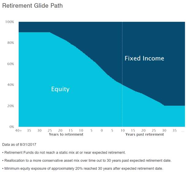 With TDFs, your asset allocation changes as the “target date” approaches. This date is the day you retire, and as you make your way there, your investments are on a “glide path” from more aggressive holdings to more conservative ones.
